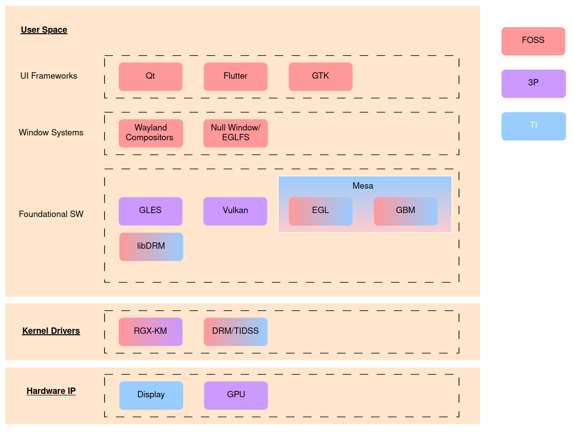 The following picture shows the software architecture of Graphics in Processor SDK Linux AM62x.